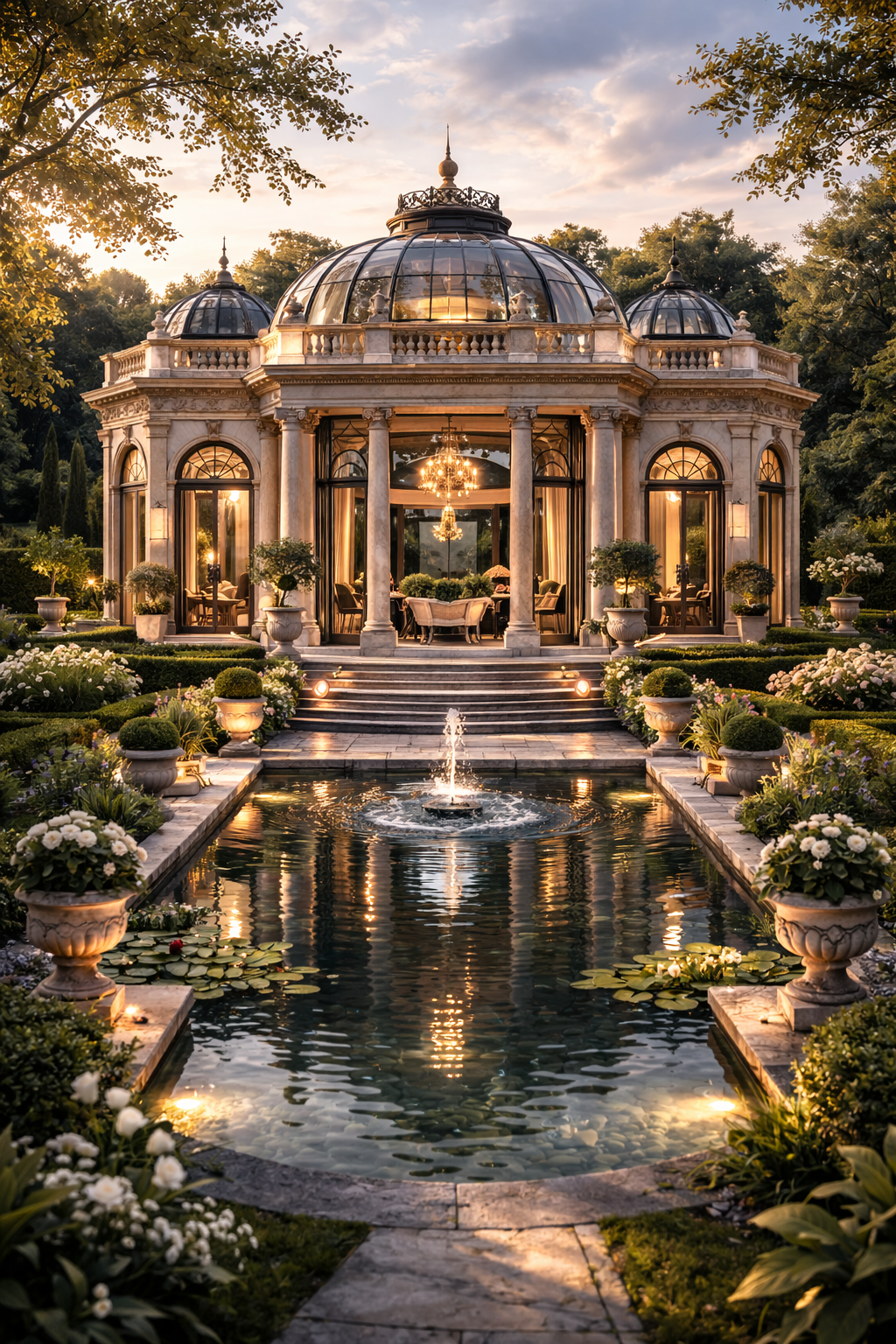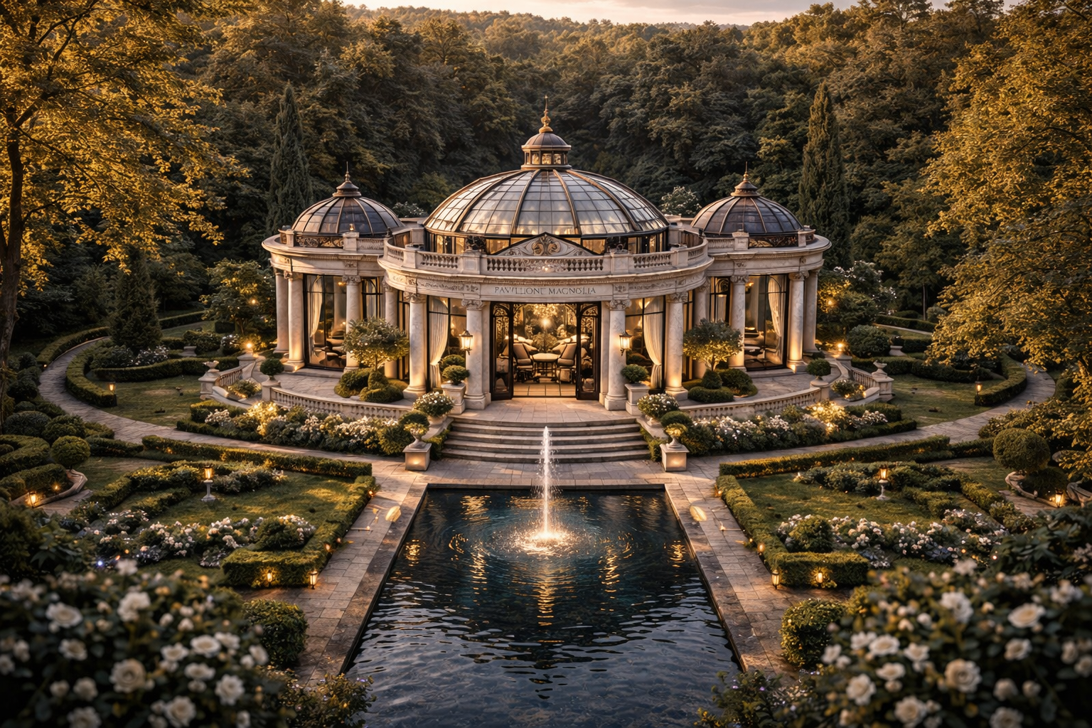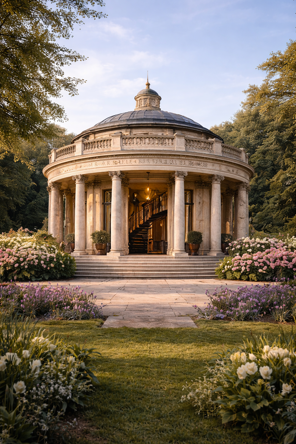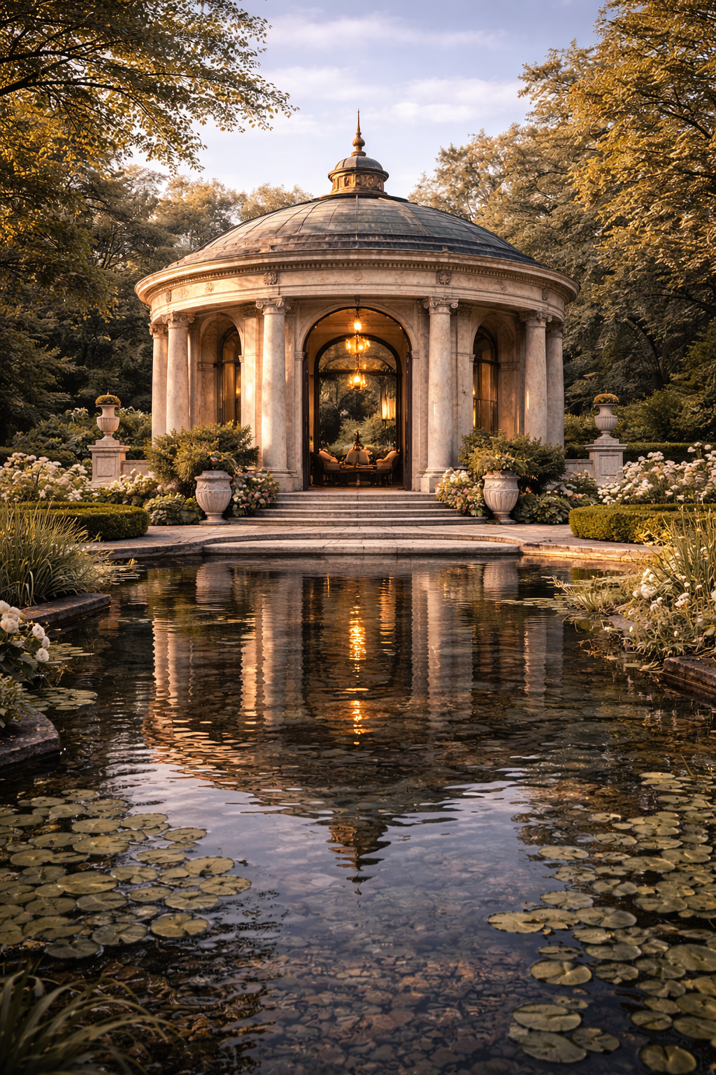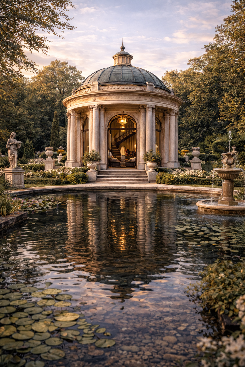 Padiglioni neoclassici concepiti come micro-architetture contemplative immerse nel paesaggio, caratterizzate da proporzioni armoniche, colonnati eleganti e materiali nobili come marmo, pietra chiara e ardesia. Ogni struttura fonde simmetria architettonica, luce naturale e rapporto diretto con il giardino, trasformandosi in spazi di lettura, rappresentanza e quiete aristocratica. Non semplici gazebo, ma fulcri scenografici e culturali del parco: sobri, monumentali e senza eccessi barocchi, progettati per dialogare con la tenuta e valorizzare l’asse prospettico del paesaggio